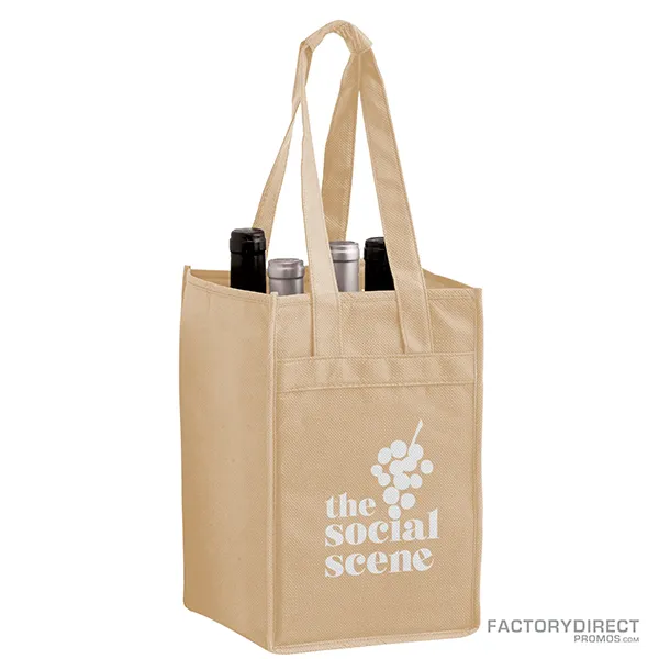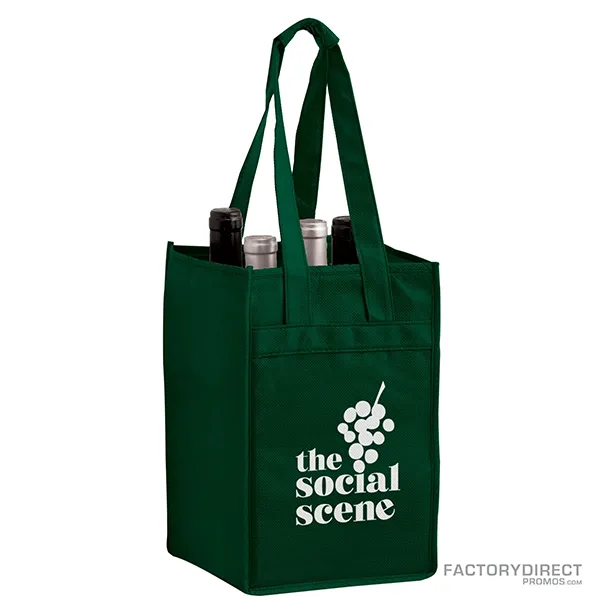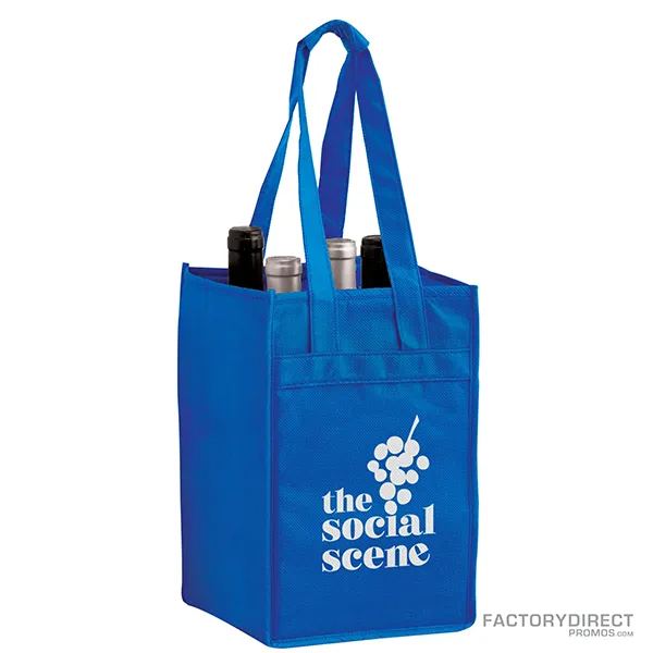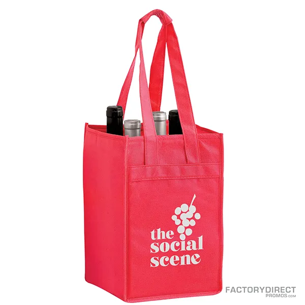 Personalized wine bags are a perfect way to promote your brand with your custom logo or other branded customized artwork. These reusable 4-bottle custom wine bags in bulk are made from eco-friendly polypropylene material and feature reinforced handles, a bottom board, and inside dividers. These bags are known for their durability. Available in various colors, these in-stock custom wine bags are made of recycled material are imprint-ready, and can be delivered in as little as two weeks. Your business can take advantage of wholesale pricing and use these 4-bottle wine bags to improve brand awareness and visibility on a budget. If you’d like to offer a line of bags, we have 2-bottle wine bags in bulk and 6-bottle wine bags in bulk so you can order exactly what you need.
