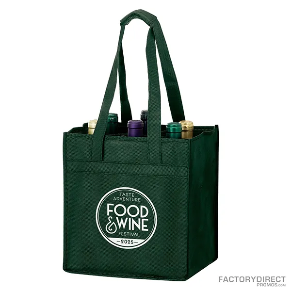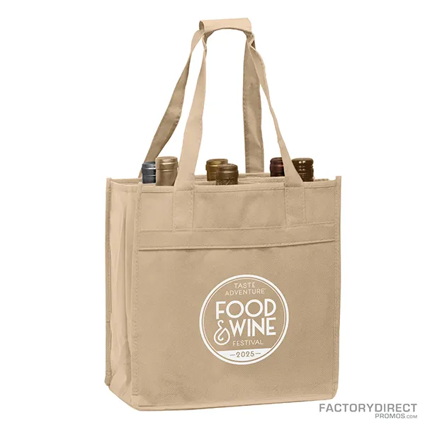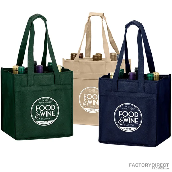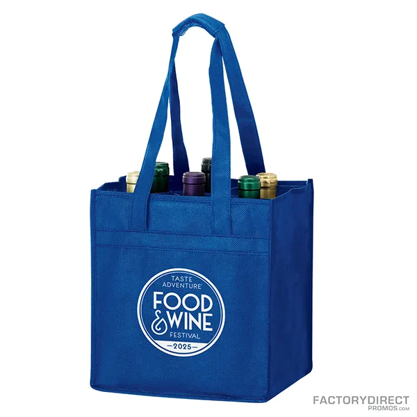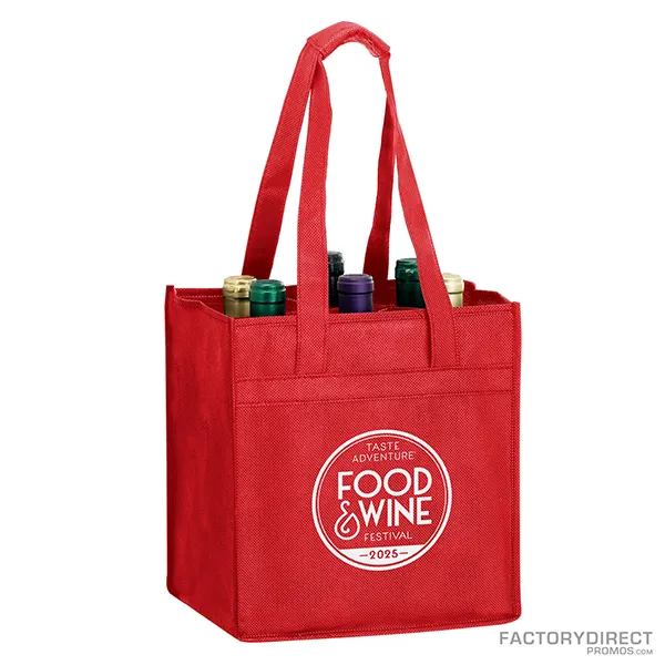 Personalized wine bags are a perfect way to promote your brand with your custom logo or other branded customized artwork. These reusable 6-bottle custom wine bags in bulk are made from eco-friendly polypropylene material and feature reinforced handles, a bottom board, and interior dividers. These bags are known for their durability. Available in various colors, these in-stock custom wine bags are made of recycled material, are imprint-ready, and can be delivered in as little as two weeks. Your business can take advantage of wholesale pricing and use these 4-bottle wine bags to improve brand awareness and visibility on a budget. If you need your own line of bags, we offer 2-bottle wine bags in bulk and 4-bottle wine bags in bulk, so you can order exactly what you need.